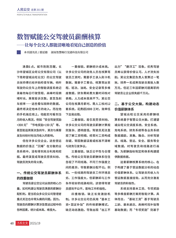 近日,智慧畅行自主研发的公交驾驶员数智化薪酬核算系统,凭借在望城众旺公交的标杆应用实践,被全国城市公共交通行业权威期刊《人民公交》2025 年第 19 期特别报道,其创新模式为公交行业破解劳资管理难题、推动数智化转型提供了典范。